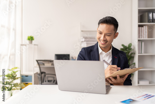 Young Asian Businesswomen smiling and happy used laptop working in the office.