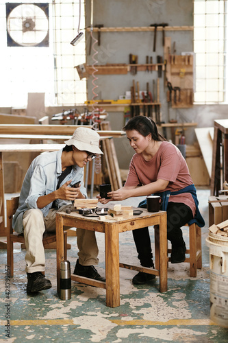 Young Asian carpenters having coffee break and discussing refence picture that customer sent via social media