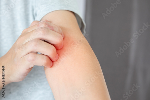 Young asian man itching and scratching on arm from itchy dry skin eczema dermatitis