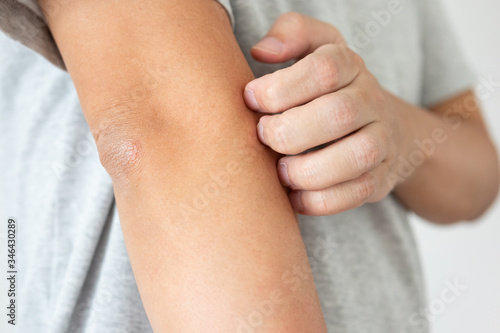 Young asian man itching and scratching on arm from itchy dry skin eczema dermatitis