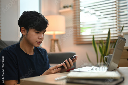 Young Asian man using smartphone and laptop for E-learning or Business.