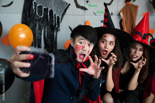 Young Asian people, a group of three persons, in scary costumes selfie their own photo. Group of friends having fun at a party in a nightclub to celebrate Halloween festival.