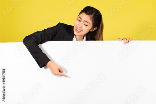 Young Asian woman in formal wear smiling and pointing at white blank banner for advertisement campaign against yellow background