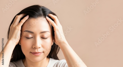 young asian woman meditating with closed eyes in calm ambiance on beige background