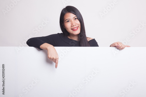portrait, asian, banner, beautiful, billboard, blank, blank sign, empty, female, finger, girl, hand, peeking, person, signs, point, pointing finger, poster, show, signs, space, studio, whiteboard, woman, young, white