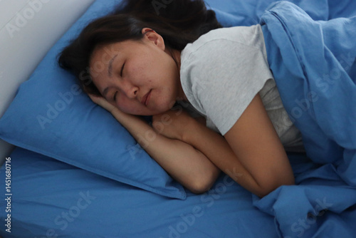 sleeping, woman, bed, peace, comfort, rest, relaxation, sleep, bedchamber, blue, sheet, pillow, asian, young, calm, serene, calmness, health, wellness, lifestyle, home, morning, night, dreaming, insomnia, nap, siesta, fatigue, rejuvenation, well-being, duvet