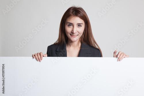 Young Asian woman with blank sign.