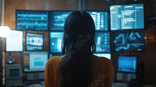 Young Asian woman working remotely on data science and AI projects at home with multiple screens displaying big data analytics and programming.