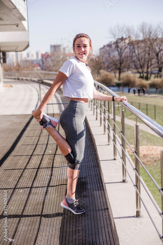 Young athletic woman in a white t-shirt and gray leggings before a workout in the fresh air does a workout.