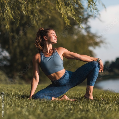 Young athletic woman practicing yoga in a serene outdoor setting by a lake at sunrise