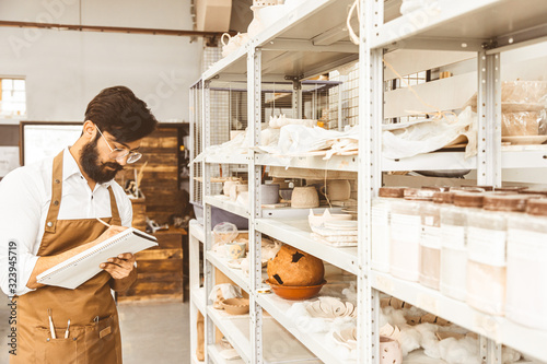 Young attractive businessman a potter with a beard and mustache works in his workshop. Keeps records and transcribes into a notebook inspecting shelves with products, conducts an inventory