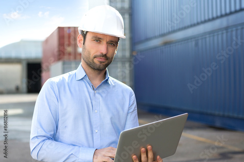 man, docker, work, dock, engineer, supervisor, container, laptop, men at work, tablet, talkie, helmet, exterior, safety, beautiful, attractive, vest, jacket, connection, import, export, shipyard, shipping, transportation