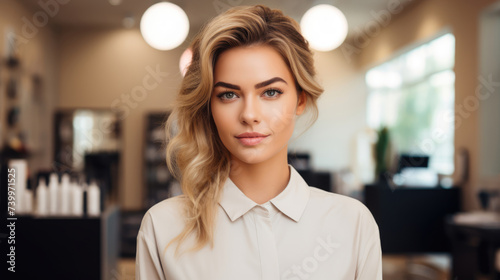 beauty, female, salon, young, ai, receptionist, attractive, standing, crossed, hand, adult, person, professional, administrator, work, portrait, happy, beautician, smiling, caucasian, hair, occupation, service, woman, business, reception, men at work, people, employee, beautiful, profession, welcome, resort, space, text, desk, fashion, appointment, travel, hairdresser, modern, adviser, pretty, office, copy, chair, hairdresser, lady