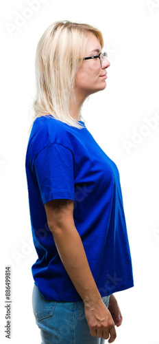 Young beautiful blonde woman wearing glasses over isolated background looking to side, relax profile pose with natural face with confident smile.