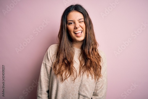 Young beautiful brunette woman wearing casual sweater standing over pink background winking looking at the camera with sexy expression, cheerful and happy face.