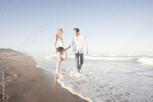 Young beautiful couple playful at the beach flirting in love