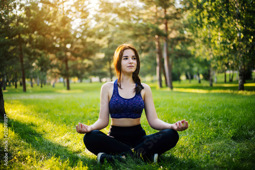 Young beautiful girl practicing yoga in the park. Woman in sportswear. Healthy lifestyle.