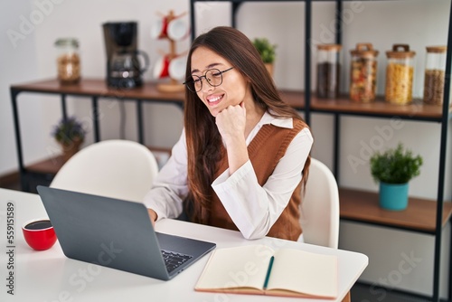 Young beautiful hispanic woman sitting on table studying at home