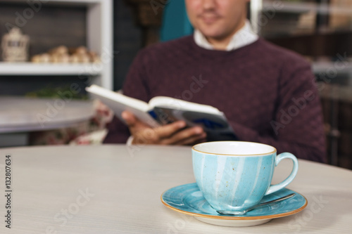 Young beautiful man sitting and drinks coffee. Also he reading a book