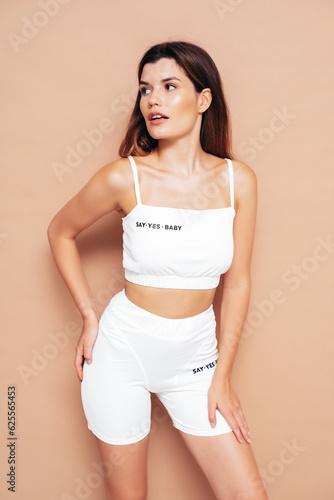 Young beautiful smiling female in trendy summer cycling white shorts and top clothes. Carefree woman posing near beige wall in studio. Positive model having fun. Cheerful and happy