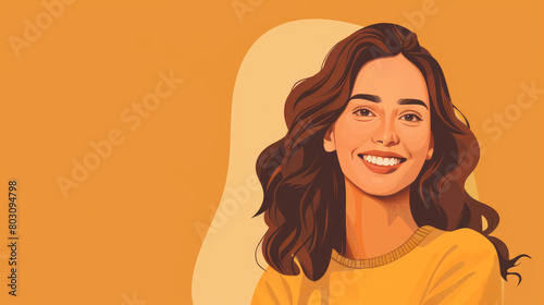 Young beautiful smiling woman portrait on simple flat yellow background with copy space. Flat illustration style, banner or post template.