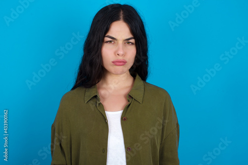 young beautiful tattooed girl standing against blue wall frowning his eyebrows being displeased with something.