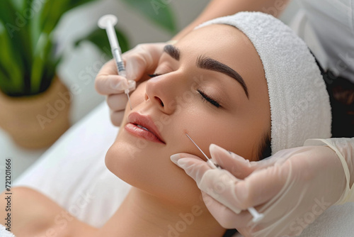 Young beautiful woman receives botox injection for face lifting. Aesthetic medicine. Cosmetology procedure in beauty clinic.