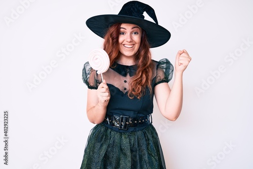 Young beautiful woman wearing witch halloween costume holding lollipop screaming proud, celebrating victory and success very excited with raised arms