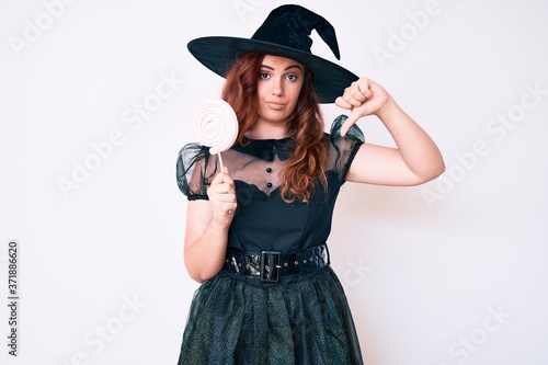 Young beautiful woman wearing witch halloween costume holding lollipop with angry face, negative sign showing dislike with thumbs down, rejection concept