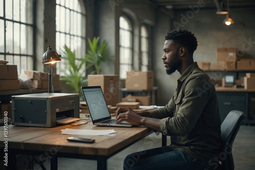 sustainable, environmentally friendly, e-business, black man, african american, office, industrial, desk, laptop, working, shipping, cardboard box, biodegradable, fulfillment, startup, entrepreneur, technology, cyberspace, digital, marketing, sale, logistic, warehouse, distribution, delivery, postal, courier, self employed, freelance, studio, natural light, focused, responsible, mindful, environmental, conservation, planet, earth, future, innovation