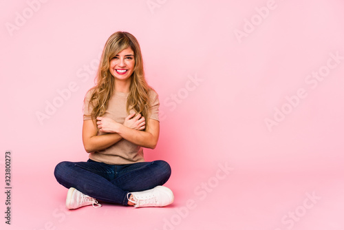 Young blonde caucasian woman sitting on a pink studio laughs happily and has fun keeping hands on stomach.