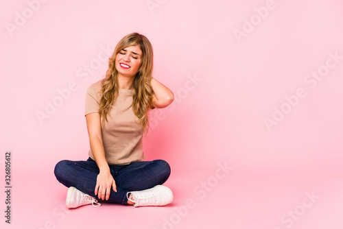 Young blonde caucasian woman sitting on a pink studio suffering neck pain due to sedentary lifestyle.