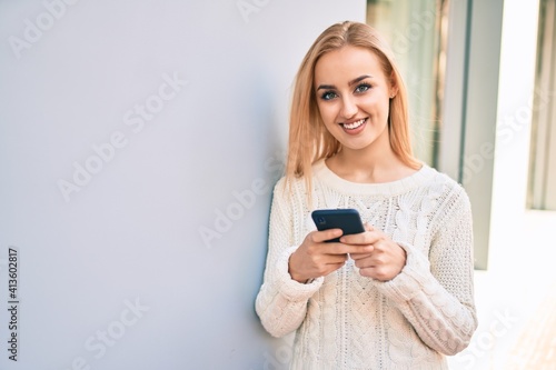 Young blonde girl smiling happy using smartphone at the city.