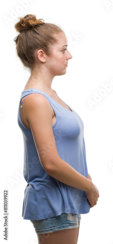 young, woman, girl, teenage, blue eye, caucasian, blond, piercing, background, isolated, wearing, t-shirt, bun, summer, holiday, vacation, face, cool, fashion, honed, side, view, profile, people, happy, hair, confident, person, looking, away, smile, smiling, serious, natural, half face, lateral, silhouette, shape, simple, model, pose, attitude, head, trust, cheerful, relax, expression