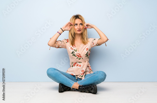Young blonde woman sitting on the floor having doubts and thinking