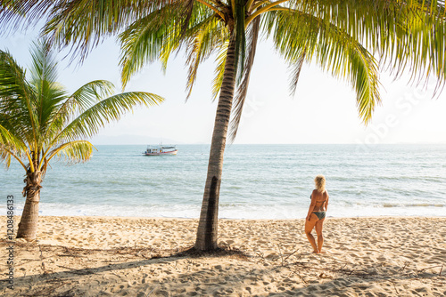 Young blonde woman standing under the palm trees and enjoying the morning sun at tropical Maenam beach on Koh Samui, Thailand