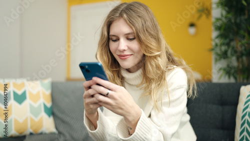 young, caucasian, woman, female, person, portrait, adult, beautiful, blond, attractive, happy, confident, smile, lifestyle, expression, positive, joy, smiling, enjoy, fun, sitting, sofa, relax, relaxing, resting, rest, comfortable, comfort, smartphone, phone, mobile phone, texting, typing, message, using, cyberspace, online, technology, device, contraption, home, house, apartment, indoor, indoor, interior, living room, room, background