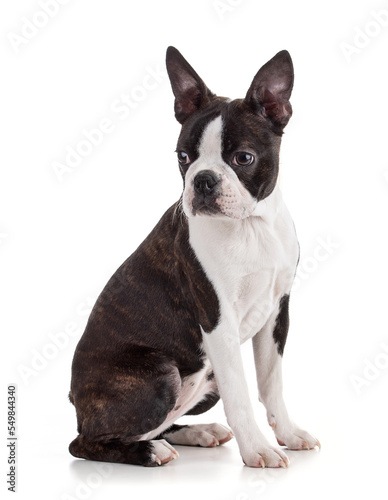 dog, puppy, boston terrier, animal, sitting, pet, breed, pedigree, portrait, canino, studio, isolated, white background, domestic, adorable, brindle, white, funny, small
