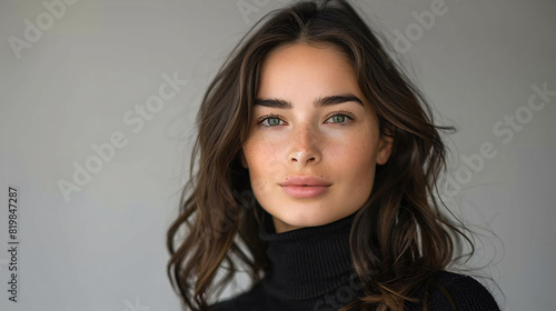 Young brunette lady with a sophisticated look, standing confidently in a studio setting