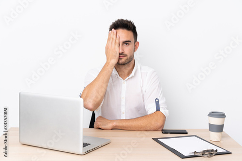 Young business man with a mobile phone in a workplace covering a eye by hand