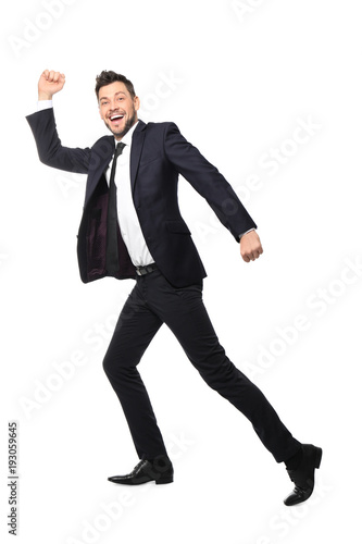 Young businessman running on white background
