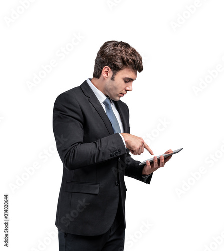 businessman, tablet, computer, using, technology, business, isolated, man, white, office, portrait, attaching, wireless, work, caucasian, connection, pad, success, touch, touch screen, write, attractive, communication, cyberspace, modern, standing, person, salesman, background, confidence, confident, content, cool, good, guy, wi-fi, formal, suit, young, photogenic, finger, programming, message, engineer, social, media, side, view