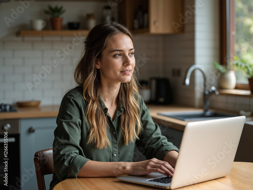 Young businesswoman manage business from home on remote, freelancer using laptop sit kitchen table on self-quarantine, work over personal growth, apply for online courses to learn new skills.