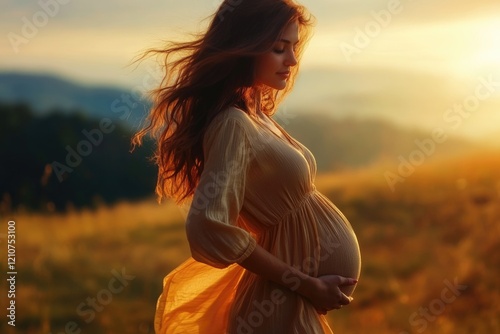 pregnancy, female, young, sunset, nature, caucasian, serene, expectant, peaceful, maternity, woman, grass, dress, sunlight, outdoors, glow, mother, warm, gold, field, landscape, horizon, beauty, gentle, calm, hill, moment, solitude, life, anticipation, calmness, tenderness, hugs, journey, silhouette, rural, season, breeze, harmony, happiness, connection, mountain, scenic, radiant, idylli