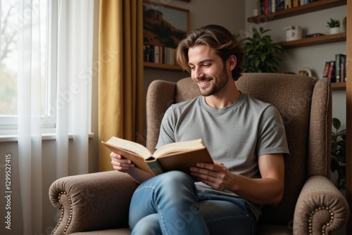 man, reading, book, relaxation, caucasian, indoor, natural, light, cosy, smile, leisure, living room, enjoyment, style, furniture, interior, armchair, youth, culture, hobby, peace, sunlight, homely, warmth, elegance, serenity, comfort, portrait, thoughtful, casual attire, scene, decor, youthful, expression, home, educational, literature, intellectual, escape, distraction, activity