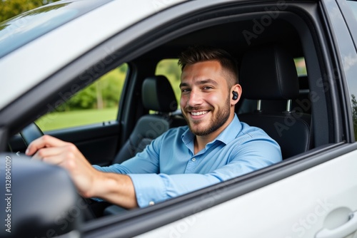 male, young, caucasian, driver, car, smiling, earbud, blue, shirt, photogenic, vehicle, transportation, smart, outdoors, nature, happy, communication, technology, casual attire, smile, man, interior, active, portrait, lifestyle, modern, professional, wearing, comfort, joyful, accessory, business, urban, automobile, greenery, scene, fitness, healthy, enjoyment, road, audio