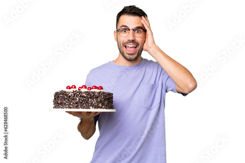 Young caucasian man holding birthday cake isolated on green chrome background with surprise and shocked facial expression