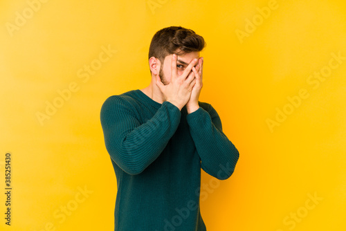 Young caucasian man isolated on yellow background blink through fingers frightened and nervous.