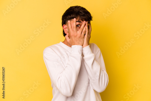 Young caucasian man isolated on yellow background blink through fingers frightened and nervous.