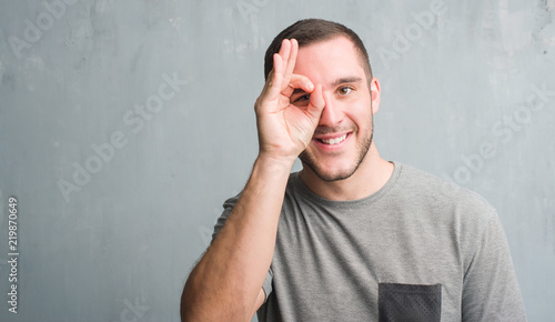 Young caucasian man over grey grunge wall with happy face smiling doing ok sign with hand on eye looking through fingers